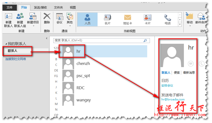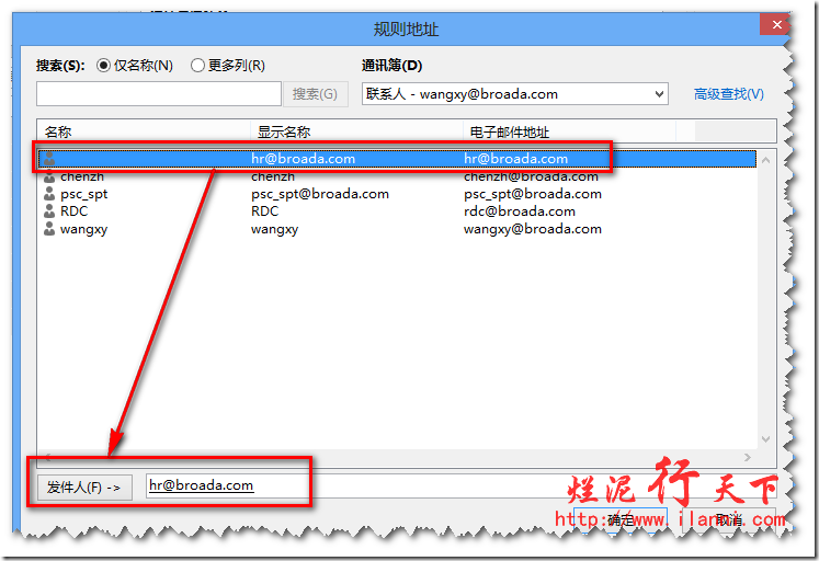 下面就先设置“发件人为个人或组”点击进去,选择hr这个联系人,如下图示: