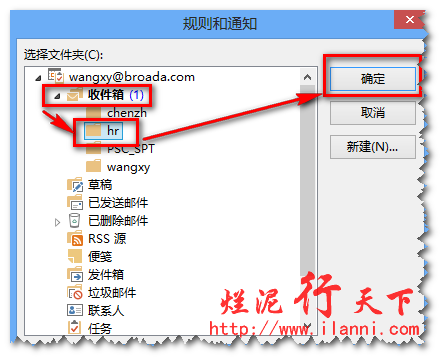 发件人添加到通讯录中后,我们在收件箱下建立一个相应的分组文件夹。此次以hr@broada.com为例,在收件箱下新建一个hr的文件夹,如下图示: