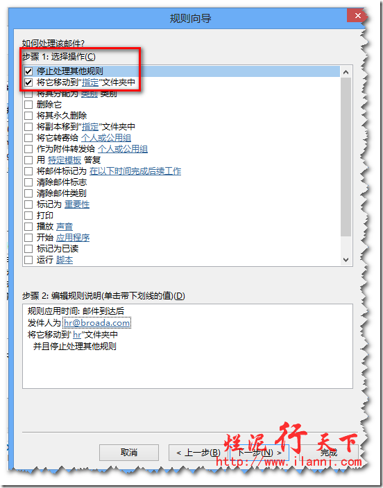 这步主要是设置邮件过滤后要执行的动作。继续“下一步”,如下图示: