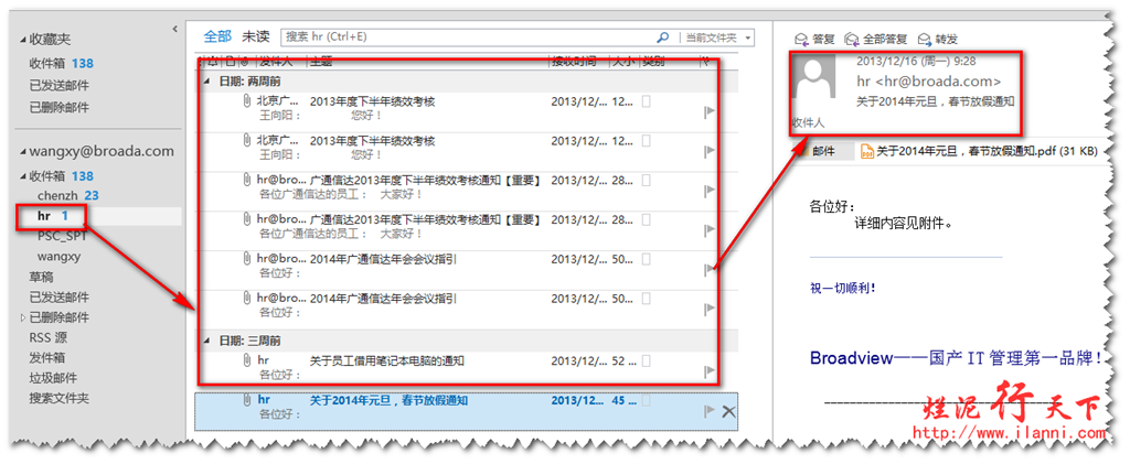 通过上图我们可以看到,现在所有hr@broada.com发送过来的邮件,都会移动到hr这个文件夹下。这样就更有利于对邮件的管理。