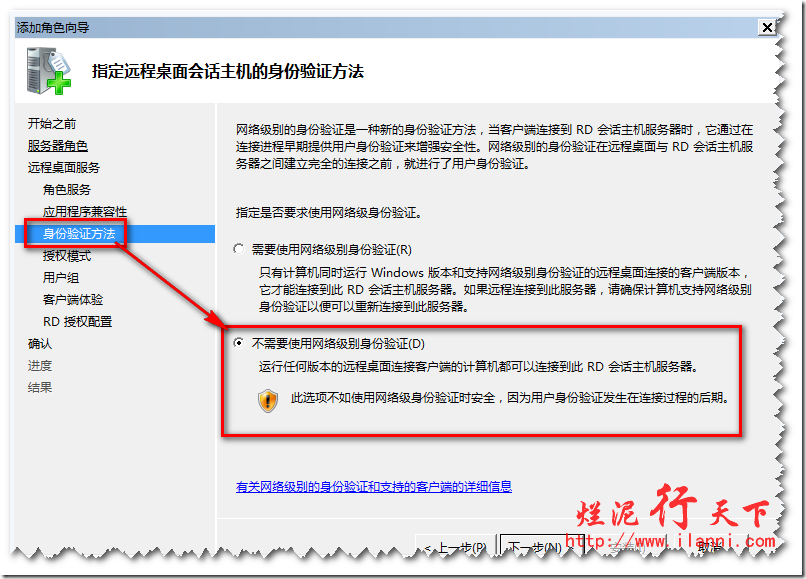 “身份验证方法”建议选择第二个“不需要使用网络级别身份验证”,因为如果选择第一项的话。如果是XP系统连接Server 2008,那么系统就会提示你无法连接。