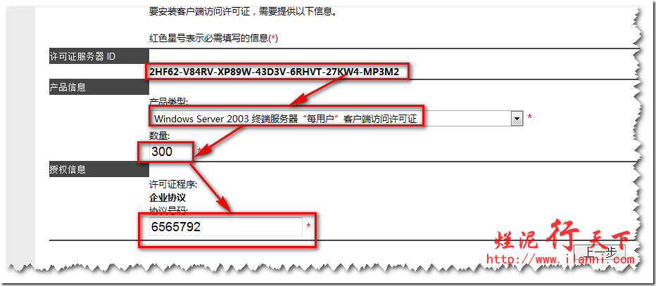 在这个地方一定要注意“产品类型”,在此一定要选择“Windows Server 2003终端服务器“每用户”客户端访问许可证”,而“协议号码”,我们可以填写6565792,4954438,6879321或者5296992。数量可以填写任意,如下图示: