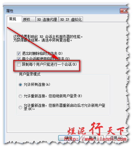 双击该选项,然后把“限制每个用户只能进行一个会话”对勾去掉,如下图示: