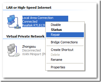 控制面板 - 网络连接- 在"本地连接"上右键单击,选择‘修复’: