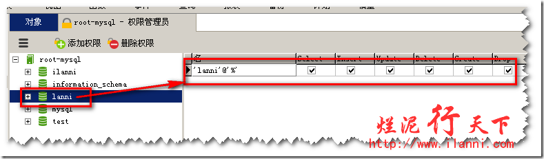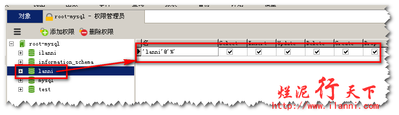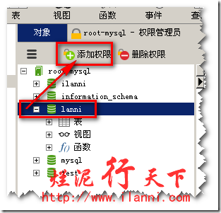 点击“lanni”这个数据库,在右侧可以看到目前lanni这个用户对lanni这个数据库不具有相关的权限。那么,我们现在再次点击面板上的“添加权限”,如下图: