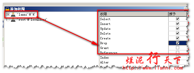 在弹出的窗口中选择“lanni”用户,然后在右侧选择相应的权限,如下图: