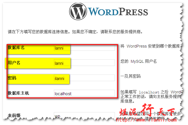 我们现在使用WordPress博客程序进行测试,我只截数据库配置的图片,其他的就不做截图了。如下图:
