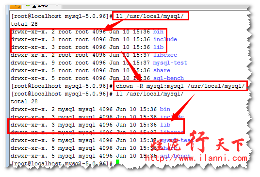修改完毕后,我们还需要修改/usr/local/mysql的所属用户及用户组,如下图: