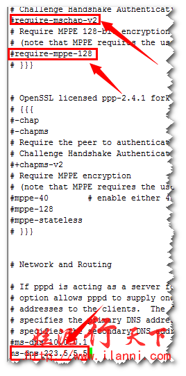 我们需要注释掉require-mschap-v2和require-mppe-128两行,同时还要启用ms-dns。如下图: