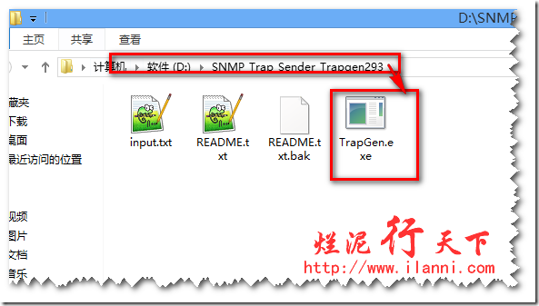 我们现在以一个例子做说明,该运行文件是一个有关SNMP Trap发送的程序。我们现在把该文件存放在D盘下,如下图: