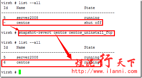以上我们把centos这台虚拟机在安装FTP命令前后的快照已经做好,现在虚拟机centos处于已经安装FTP命令状态,如果我们此时要把虚拟机centos恢复到安装FTP命令之前的话,我们只需要使用virsh snapshot-revert命令即可。但是在使用virsh snapshot-revert命令恢复虚拟机centos状态之前,我们必须要把虚拟机关闭。