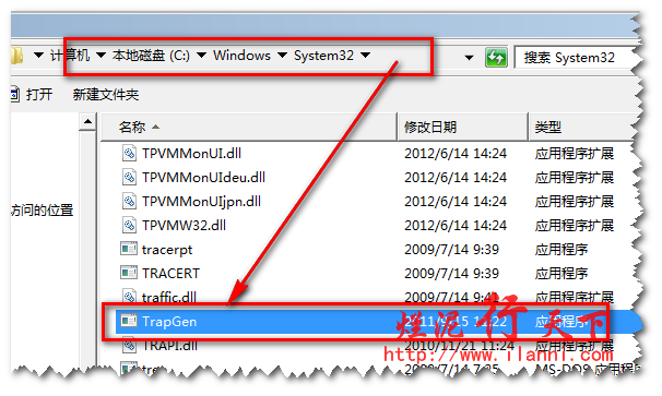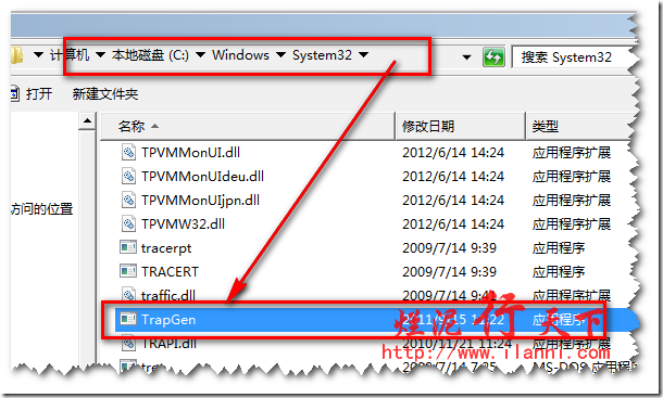 在我们开始试验之前,我们首先要你部署TrapGen,我现在把TrapGen部署在windows/sysytem32下。如下图: