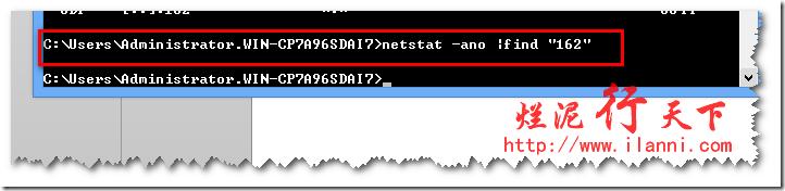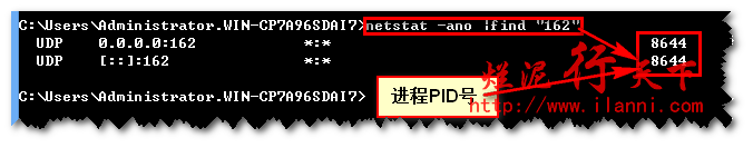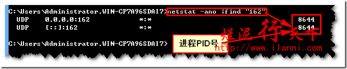 如何找出是哪一个进程占用了该端口,我们可以使用“netstat –ano |find “162””命令,找出来,如下图示: