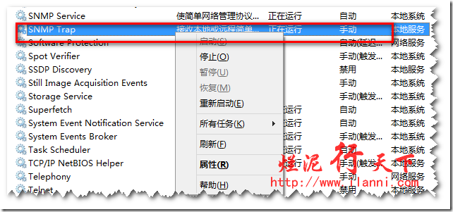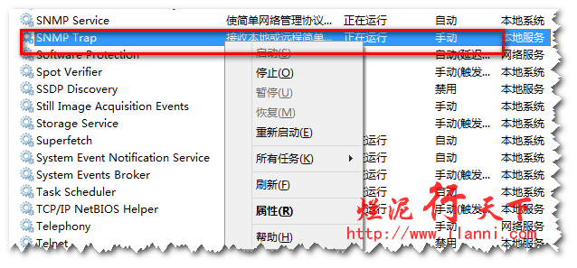 通过上图我们可以很明显的看到原来是snmptrap.exe进程占用了162端口,我们只需要把改进成禁用或者是禁用该进程的服务即可。snmptrap.exe其实是windows中的SNMPTrap服务所使用的进程,我们只需要把SNMPTrap服务禁用或者停止即可。如下图示: