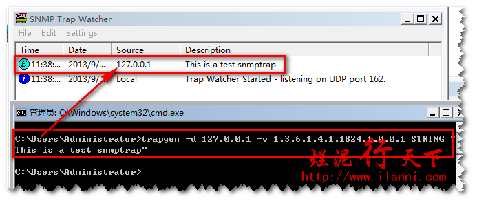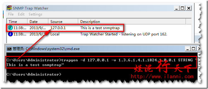 现在我们的SNMP_Trap_Watcher就可以正常运行了。SNMP_Trap_Watcher正常后,我们来通过TrapGen手动产生一个告警,代码为“trapgen -d ilanni.com -v 1.3.6.1.4.1.1824.1.0.0.1 STRING “This is a test snmptrap””,如下图:
