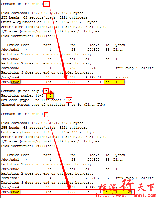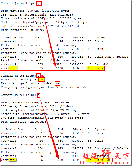 注意扩展分区和逻辑分的开头柱页是相同的,并且逻辑分区已/sda5开始,这个是因为一块硬盘最多支持5个分区,其中主分区最多为4个。除此之外,我们还可以发现逻辑分区默认的磁盘类型是Linux,但是LVM分区默认磁盘类型是8e。所以我们还要修改该逻辑分区的磁盘类型,如下: