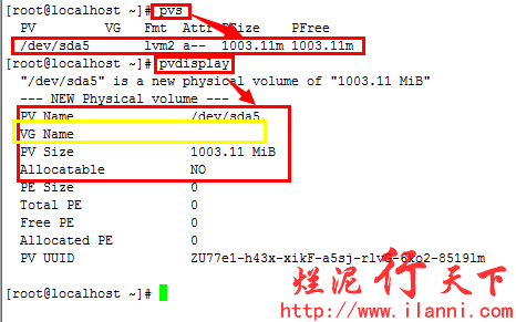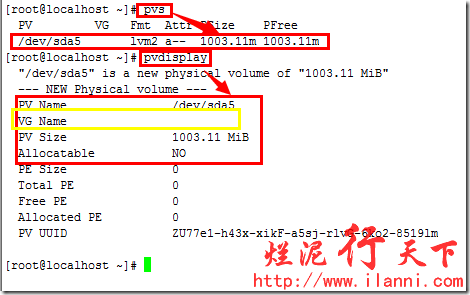 注意:目前物理卷/dev/sda5尚未加入任何一个卷组,所以图中黄色部分VG Name为空。