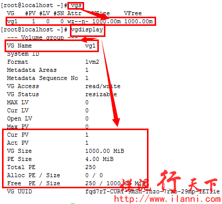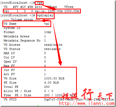 卷组vg1创建完毕后,我们可以使用vgs和vgdisplay命令查看卷组的相关信息,如下: