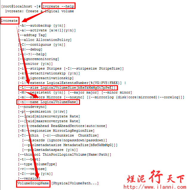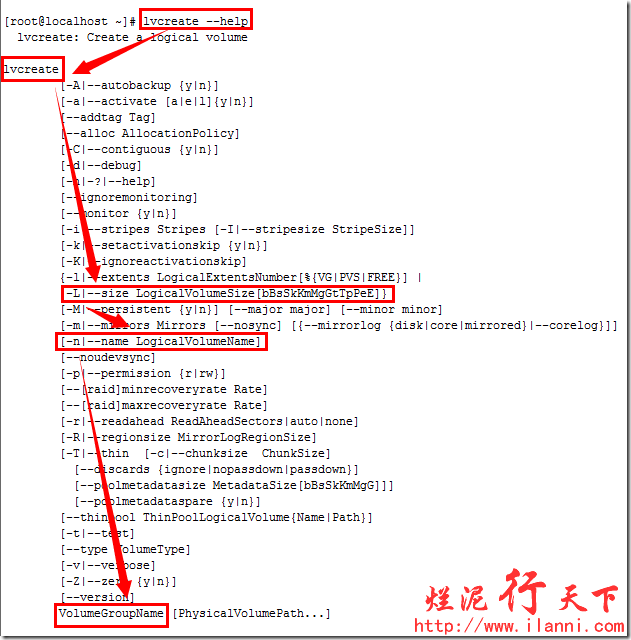 有关lvcreate命令的使用,可以参考帮助,如下: