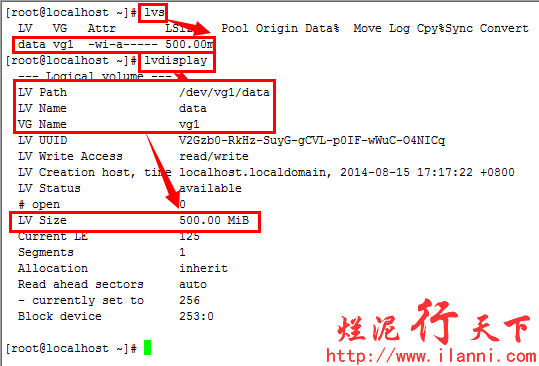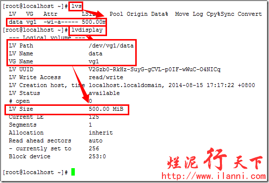 逻辑卷创建完毕后,我们可以通过lvs和lvdisplay命令查看逻辑卷的相关信息,如下: