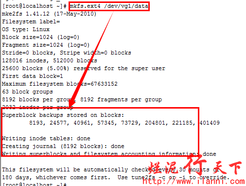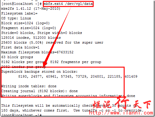 先进行逻辑卷的格式化,其实逻辑卷创建好后,就相当于一个分区。我们按照平时操作分区的方法来操作逻辑卷即可,格式化使用如下命令:
