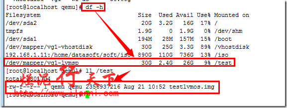 有关KVM相关的文章,可以参考我以前的博客。同时目前该逻辑卷/dev/vg1/lvmsp所挂载的目录/test是KVM一个虚拟机存放硬盘的,并且目前该虚拟机时正常运行的。如下: