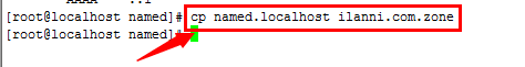 现在我们来创建ilanni.com域的zone文件,默认情况下bind是没有生成该文件的,需要我们手工添加,但是在前边我们提到过由于bind的配置文件比较复杂,所以我们建议还是使用bind为我们提供的模版文件named.localhost。如下: