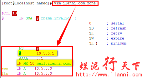 现在开始编辑ilanni.com.zone文件,并在其中加入相关的地址解析。如下: