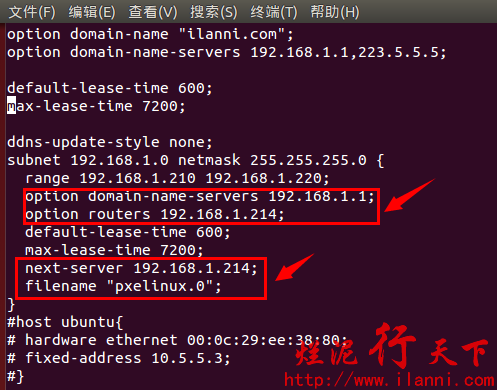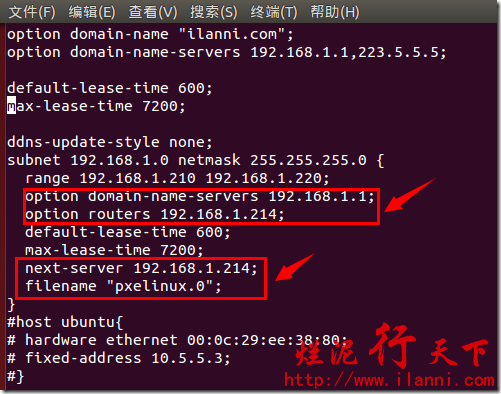 我们现在需要做的是在DHCP服务的配置中添加TFTP服务器的地址,以及客户端所要获取到的配置文件名称。如下: