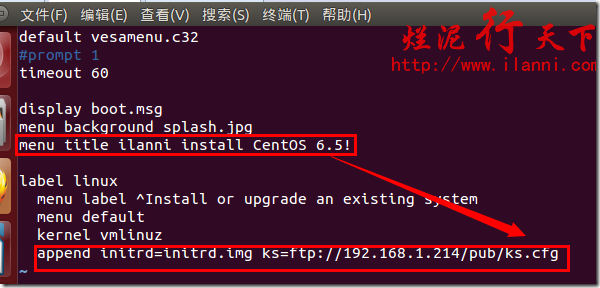 其中我们只需要注意ks=ftp://192.168.1.214/pub/ks.cfg这行,这行是需要kickstart生成的配置文件,而是使用的ftp方式访问该文件。在这我们先把该文件的名称填写进来。