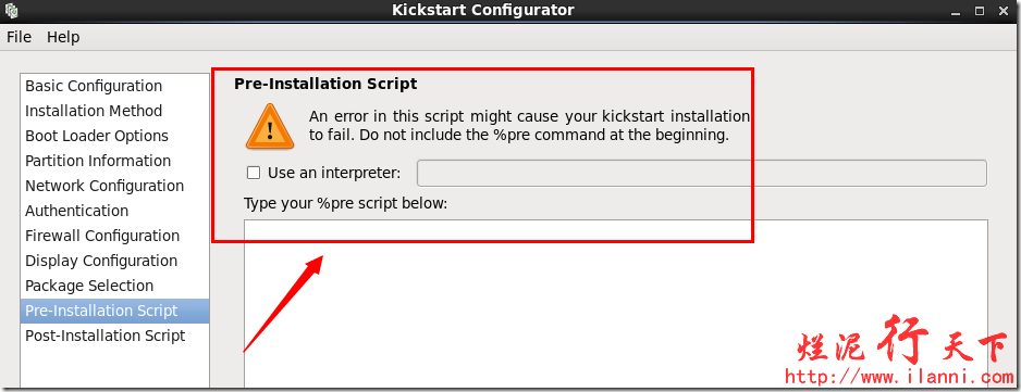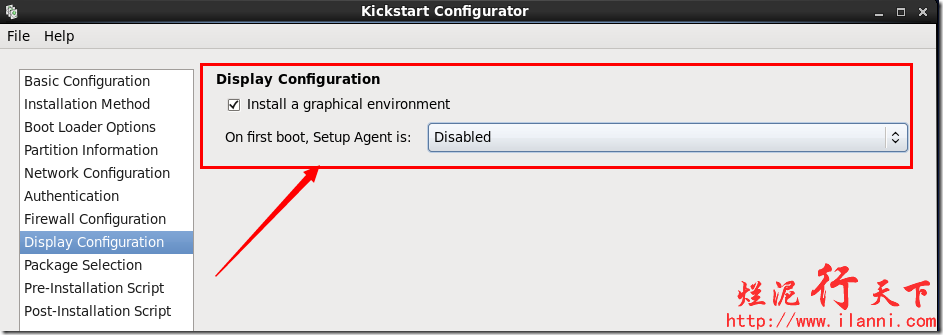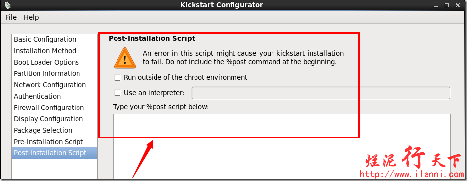 在终端下输入system-config-kickstart,系统就会弹出kickstart的配置界面,如下: