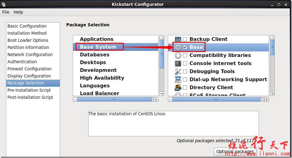 该界面主要配置需要安装的软件包。在此我要提醒下,如果你的centos镜像使用的是mini版的话,在安装包选择base后,系统安装时会报错。