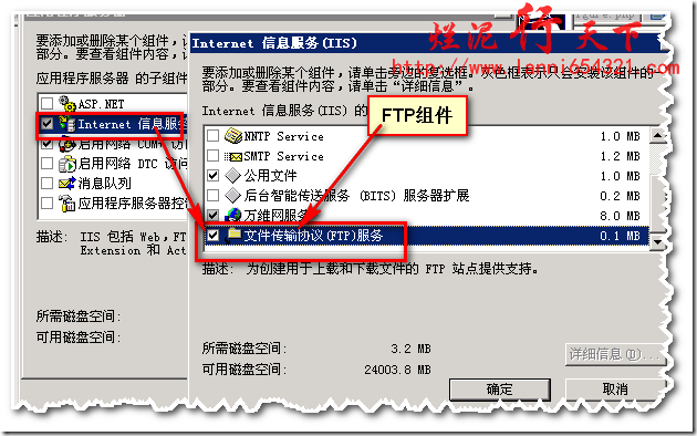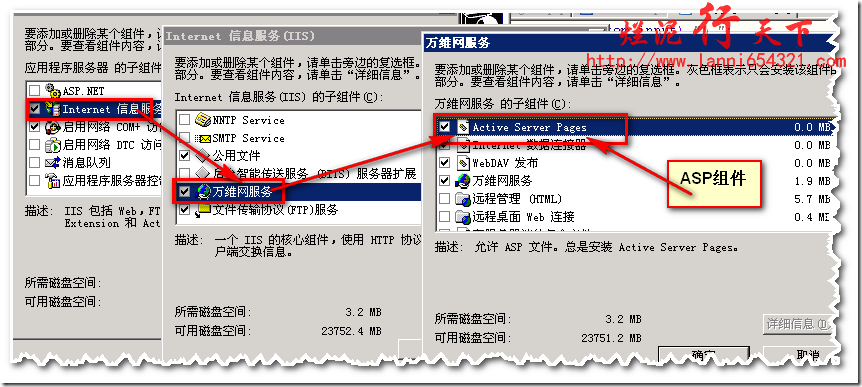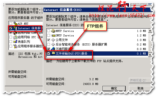 首先,我们先来安装IIS组件。关于IIS组件的安装,我想各位基本都会得,我在这也不做过多的介绍了。我主要强调的是,一定要安装FTP组件和ASP组件。