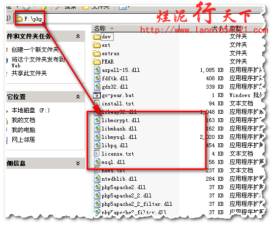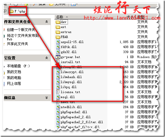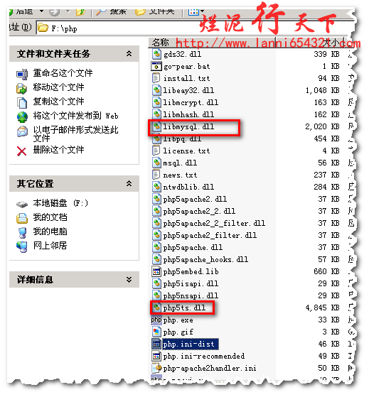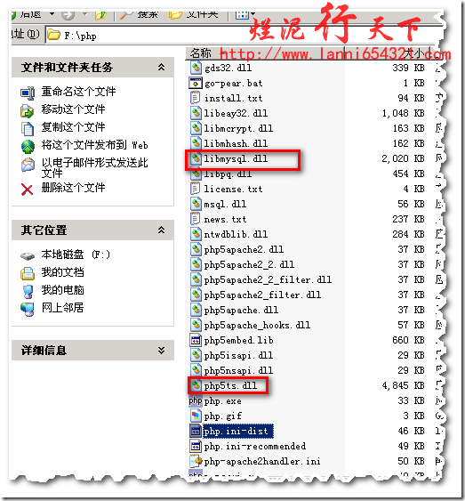 然后在 将“F:\PHP”中libmysql.dll、php5ts.dll两个文件复制到“C:\WINDOWS\SYSTEM32”中(libmysql.dll为php对mysql数据库的组件。php5ts.dll为php支持扩展功能的组件)。