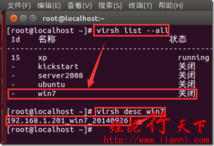 通过上图我们可以很容易的看到,目前虚拟机win7处于关闭状态,但是我们可以看到win7的IP地址是192.168.1.201。这个和我们在前面VM配置文件中填写的<description>参数一样。