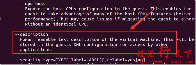 注意:<description>参数是virt-install命令支持的,virsh不支持。有关<description>参数的使用,我们可以通过man virt-install查看得到,如下: