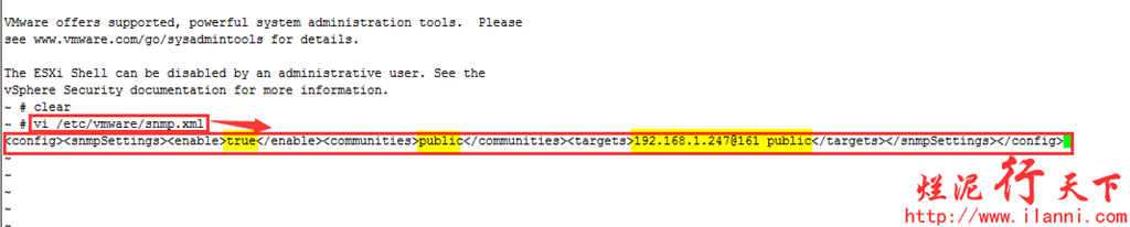 注意图中黄色部分标记出来的部分。true表示开启SNMP服务,public表示的是snmp的团体名,192.168.1.247@161 public表示该snmp使用161端口,其中表示的192.168.1.247esxi的管理IP地址。