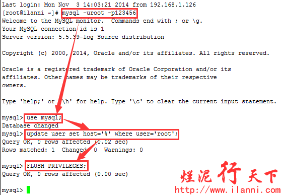 在mysql数据库安装完毕后,为了能远程连接管理mysql数据库。我们一般是在mysql服务器上通过update命令来更新user表中的host记录的。如下:
