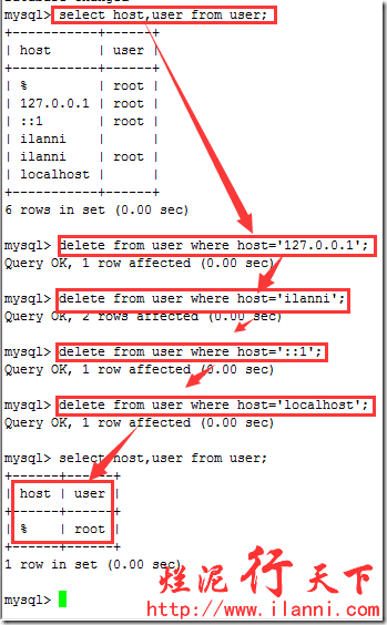 通过上图,我们可以看到目前localhost没有对应的用户。我们现在需要做的就是把,改记录中不需要的全部删除。只留下host为%的记录。