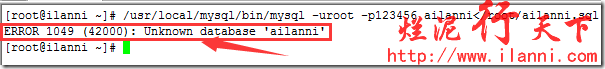 如果不创建ailanni数据库的话,我们在通过mysql命令恢复数据库时,系统就会报错,如下: