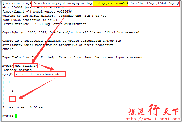 现在我们要求把ailanni数据库恢复到插入数据3后,未插入数据4时的状态。即数据库ailanni中只有数据1、2、3,这三条数据。