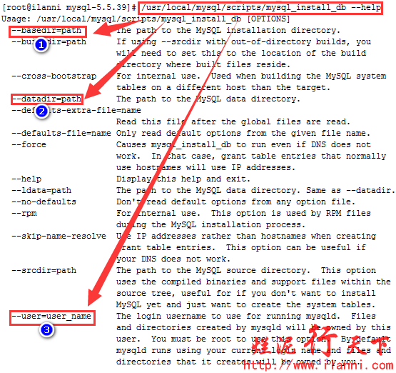 图中的1、2、3表示初始化时mysql安装的bin路径、mysql数据目录,以及运行mysql所使用的用户。