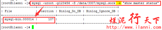 mysql -uroot -p123456 -S /data/3307/mysql.sock -e “show master status”