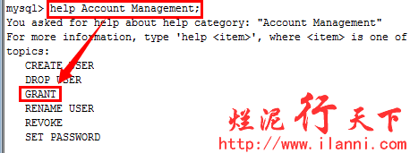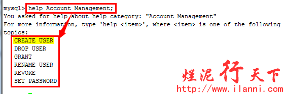 我们要创建一个新的数据库用户,但是我们又不知道使用什么命令进行创建,那我们就可以使用help contents查看所有的mysql命令目录,根据目录提示的信息我们猜想该命令应该在Account Management这个目录下。那我们就可以先查看该命令的帮助,如下: