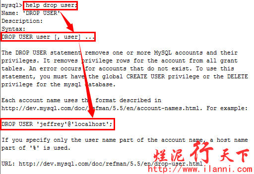 同理我们也可以查看如何删除一个用户,使用help drop user命令,如下: