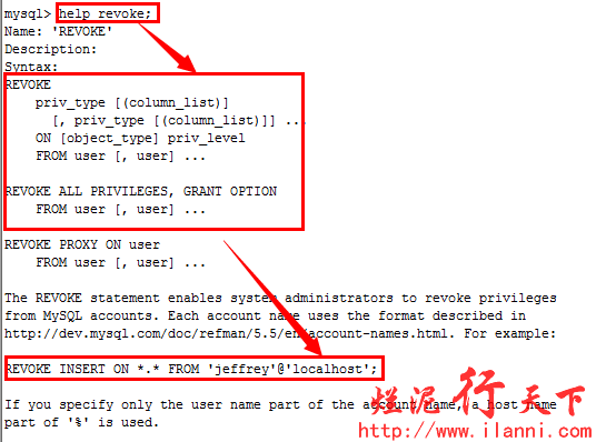 同理我们也可以删除一个用户权限,使用help revoke命令进行查看,如下:
