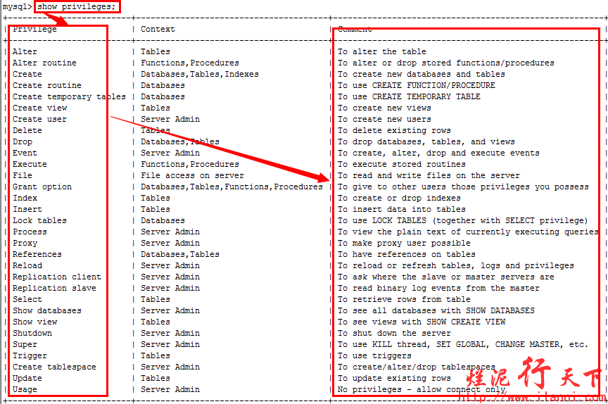 表user_privileges的privilege_type字段存储的就是mysql数据库用户的所有权限。