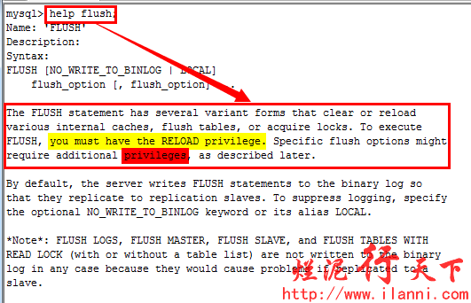 通过上图,我们可以知道刷新mysql日志的命令为flush。现在查看该命令的具体使用方法。如下: