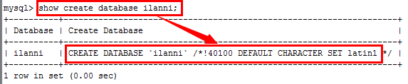 注意我们在创建数据库ilanni时,是没有指定数据库使用的语言编码的。但是系统会在执行sql语句时,自动加上语言编码,并且使用默认的语言编码latin1。