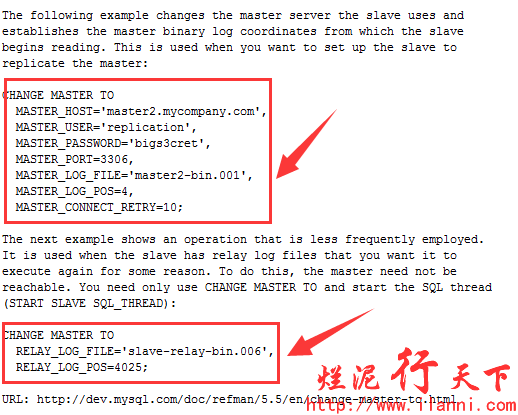 通过上述两张图,我们就能很容易的知道change master to使用方法,并且帮助信息中也给出实际的例子。